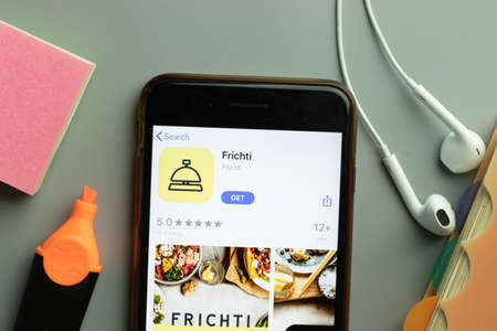 New York, USA - 1 December 2020: Frichti mobile app icon on phone screen top view, Illustrative Editorial.