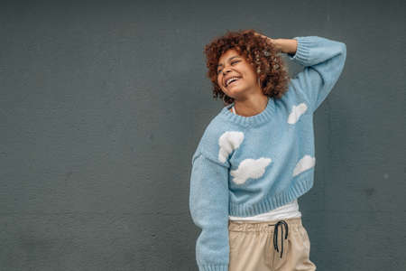 portrait young african american girl isolated on street wall