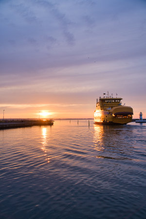 Ferry leaving harbor to Visingsoe island on Vaettern lake for sunset. Lighthouse in the background. Landscape shot from Scandinavia