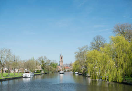Boats, houses and church tower in old town of Grouw, Friesland, Netherlands