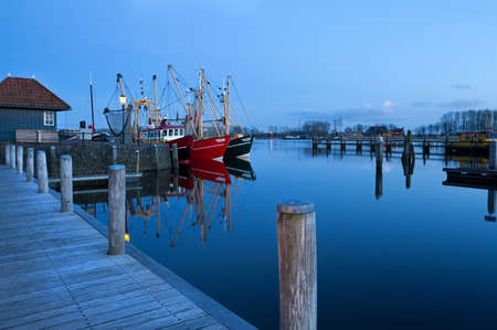 Old fishing ship in a harbor of a dutch village. Horizontal shot