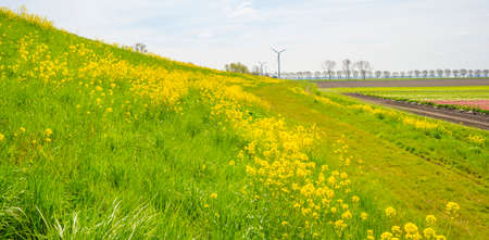 Yellow wild flowers blooming in green grass on a dike along an agricultural field in sunlight below a blue cloudy sky in spring, Almere, Flevoland, The Netherlands, April 24, 2021
