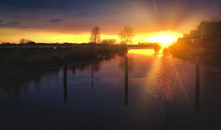 The center of Schiedam with beautiful narrow streets and small canals, photo tasks in the evening hours with beautiful orange and blue clouds. South Holland Province