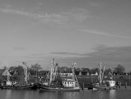Cuxhaven, Germany - 02.25.2022: Panorama of the city with green flood barrier in the port of Cuxhaven on very early winter morning.