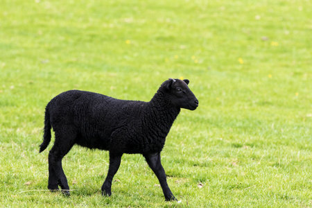 A black sheep confidently stands in front of a flock of white sheep grazing on lush green grass. The sky is overcast, creating a serene yet striking atmosphere in the pasture.
