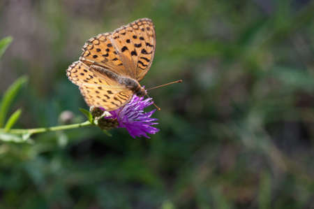 The dark green fritillary butterfly collects nectar on flower. Speyeria aglaja, previously known as Argynnis aglaja is a species of butterfly in the family Nymphalidae.