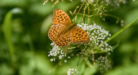 Pearl-Bordered family insects butterflies feeding on white flower umbrella