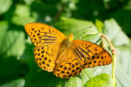 Closeup of a Silver-washed fritillary female butterfly, Argynnis paphia ,. This specie extinct in Holland but is making a comeback the last years due to climate change.
