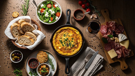 An abundant spread of Italian antipasto featuring a frittata, various charcuterie, cheeses, a fresh salad, bread, olives, and a glass of red wine on...