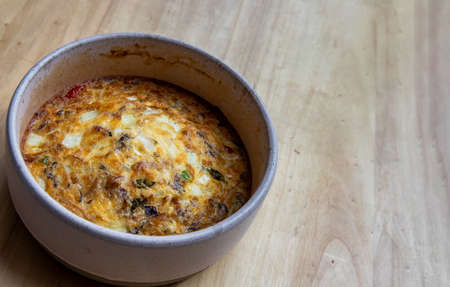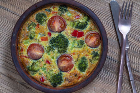 Ceramic bowl with vegetable frittata, simple vegetarian food. Frittata with egg, tomato, pepper, onion, broccoli and cheese on wooden table, close up. Italian egg omelette