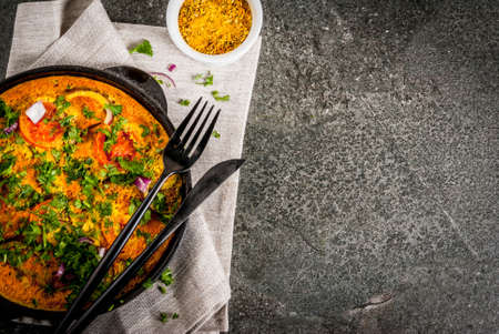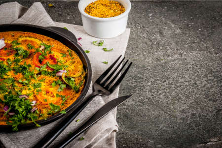 Indian food recipes, Masala Omelette with fresh vegetables - tomato, hot chili pepper, parsley, dark stone background, copy space