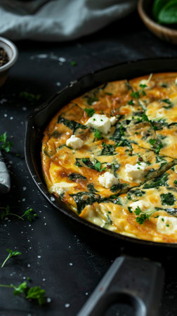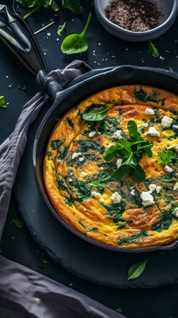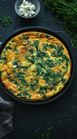 Spinach and Feta Frittata, Black Surface Table, minimalistic decor