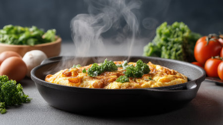 Experience the art of cooking with this captivating image of a steaming omelette in a skillet. Fresh ingredients and vibrant colors highlight a culinary masterpiece.