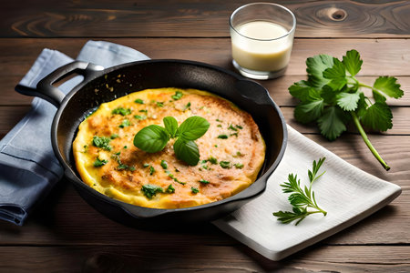 omelette with spinach and herbs in a cast iron skillet on a wooden table. Generative AI