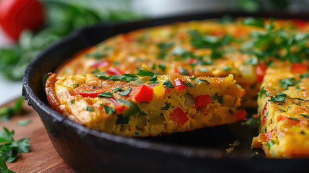 A steaming bowl of freshly cooked frittata is presented with vibrant vegetables and herbs. Perfect for breakfast or brunch, this dish showcases colorful ingredients and a rustic charm.
