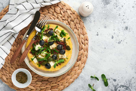 Scrambled eggs. Light, Fluffy and Buttery Scrambled Eggs with feta cheese, sun-dried tomatoes and black olives on plate over white stone background. Delicious breakfast. Top view, flat lay.