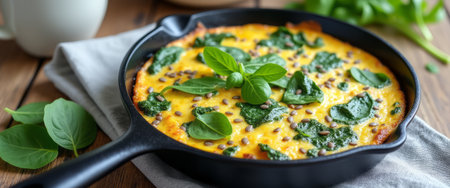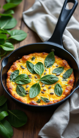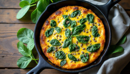 A vibrant frittata, bursting with fresh spinach and sprinkled with seeds, rests in a rustic cast iron skillet. The warm, golden hues of the dish contrast beautifully with the earthy wooden background, evoking a sense of home-cooked comfort and healthy eating.