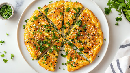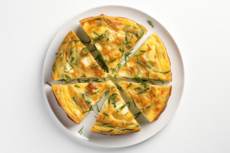 overhead shot of veggie omelette cut into slices, created with generative ai