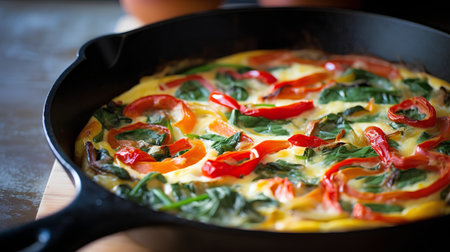 Omelet with bell pepper and spinach in a cast-iron frying pan
