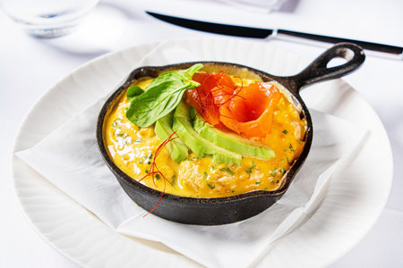 Delicious omelette and breakfast plate on the table.