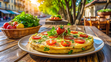 Omelette with tomatoes and herbs on a wooden table in a cafe