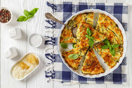 Scarpaccia, zucchini tart cut in slices in a baking dish on a white wooden table table, horizontal view from above, italian cuisine, flat lay