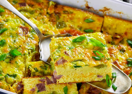 close-up of piece of Oven Baked Denver Omelet in a ceramic baking dish on a rustic wooden table , american recipe, horizontal view from above