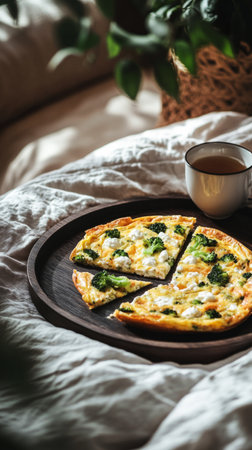 Frittata with broccoli, goat cheese, and Parmesan served with hot tea and mint leaves on a dark wooden tray, creating a peaceful and elegant morning scene in a bright bedroom