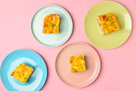 Plates with pieces of mashed potato casserole on color background