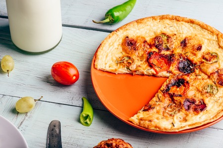 Frittata with chorizo, tomatoes and chili peppers on plate over light wooden