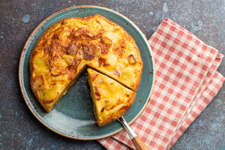 Spanish omelette with potatoes and onion, typical Spanish cuisine. Tortilla espanola. Rustic dark background