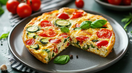 A freshly made vegetable frittata is served on a dark plate, showing cherry tomatoes, zucchini, and basil. The rustic table setting adds warmth to the meal.