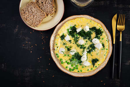Healthy breakfast. Omelet with green peas, feta cheese and dill. dark background. top view