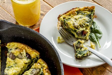 Plate of frittata with spinach, tomatoes and cheese on wooden table with orange juice