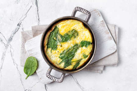 Top view of tasty omelet with green spinach leaves in vintage frying pan with linen napkin on wooden board and white marble background