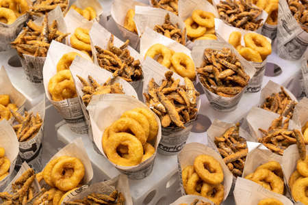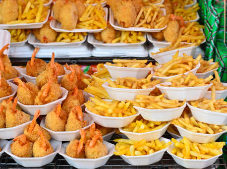 Various fried seafood on the counter ready to eat. Street food festival. Selective focus.