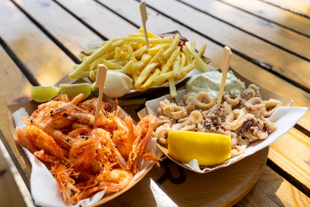 Fried shrimps, calamari, and fries with sauces and lemon served outdoors