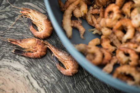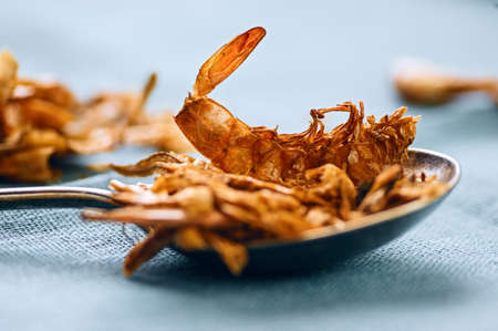 Traditional asian seafood dried orange prawns in spoon on blue background macro