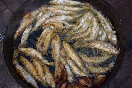 Frying mackerel fishes cooking with hot oil pan with indoor low lighting.