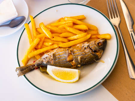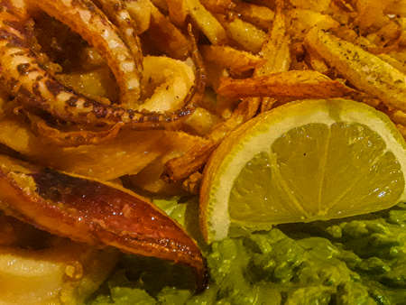 Table with food. Fried fish meal with french fries and squids on the plate photo.