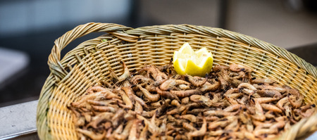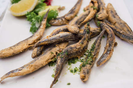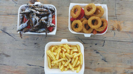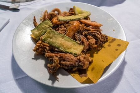 Typical Italian dish, mixed fried fresh fish with squid rings, sardines and shrimp.