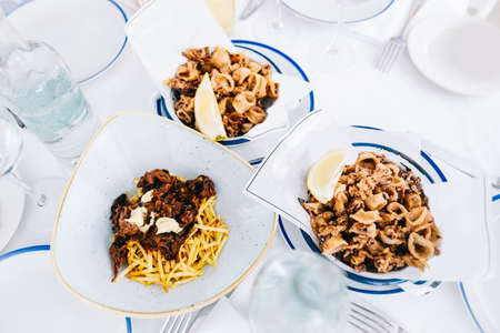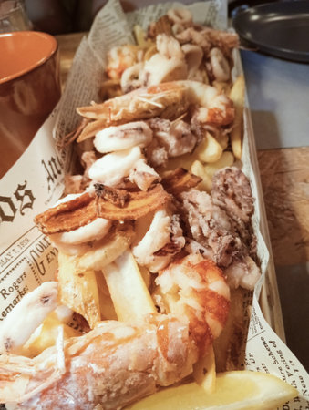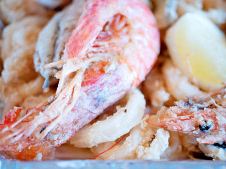 A typical Italian dish fried seafood: shrimp, squid, octopus and a slice of lemon. Italian fast food. selective focus. Banner. horizontal orientation.