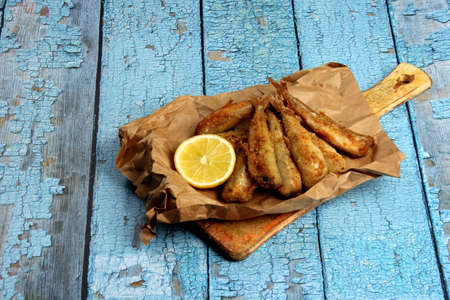 Fried small fish anchovy on board and beer on a blue table in the bar with a nautical theme. Spending fun time with great food.
