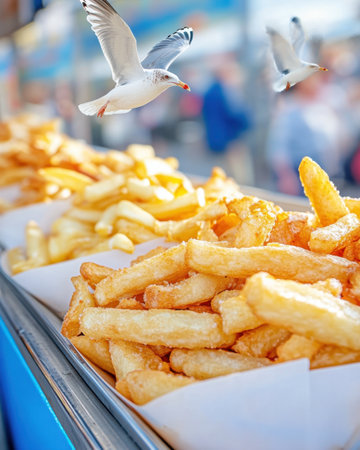 A bustling fish and chips stand in Brighton, with delighted diners savoring their meals beneath the seagulls overhead.