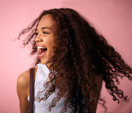 Positive young woman with curly hair grimace posing emotion studio model unaltered
