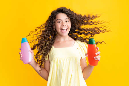 Teenager child girl showing bottle shampoo conditioners or shower gel. Hair cosmetic product. Bottle for advertising mock up copy space. Excited teenager, glad amazed and overjoyed emotions.
