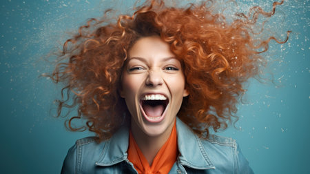 Close up portrait of a beautiful young woman with curly hair on blue background