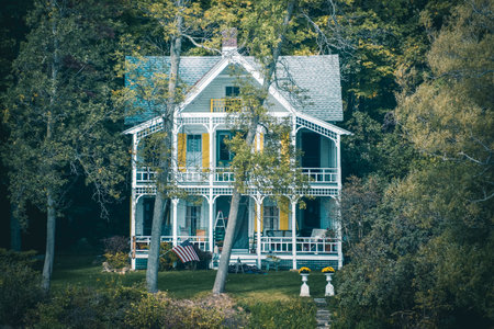 Cinematographic concept of a mystery country house in the middle of the forest, surrounded by trees. During the day. Thousands Islands. Ontario, Canada/United States