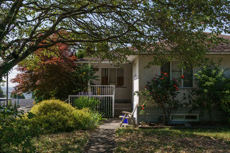 BURNABY, CANADA - JUNE 15, 2019: summer garden blooming tree in front of beautiful house