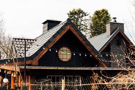 A beautiful cottage features a dark wooden exterior and a cozy round window. Outdoor string lights create a warm atmosphere surrounded by trees and nature on a clear day.